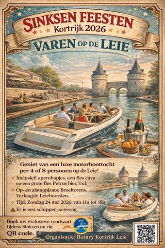 Ontdek de Sinksenfeesten op een uniek wijze, en vaar met ons mee. Op zondag 24 mei vaar je mee met Rotary Kortrijk Leie boot en ontdek je Kortrijk op een uniek wijze! Een boottochtje duurt 30 min, en kan geboekt worden per halve of volledige boot (4 of 8 personen) We zorgen voor drankjes en hapjes aan boord, zo wordt het een onvergetelijke sinksenzondag!